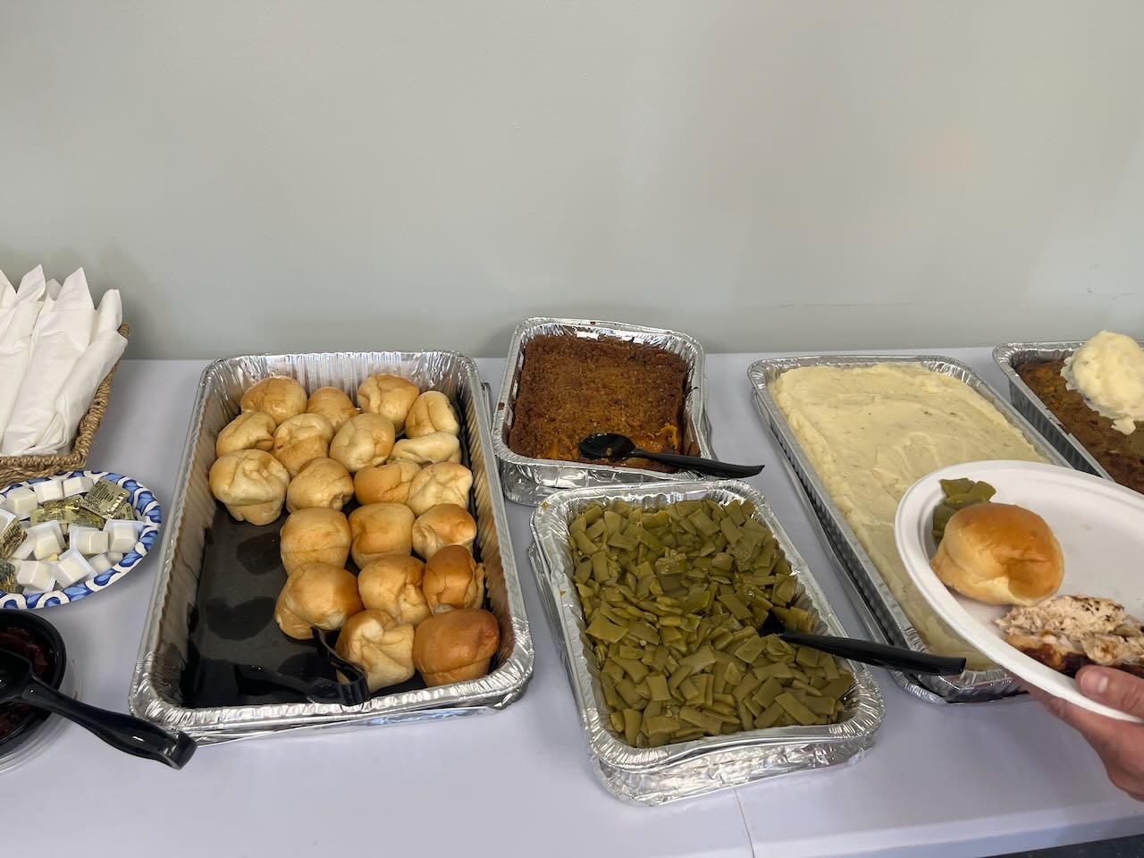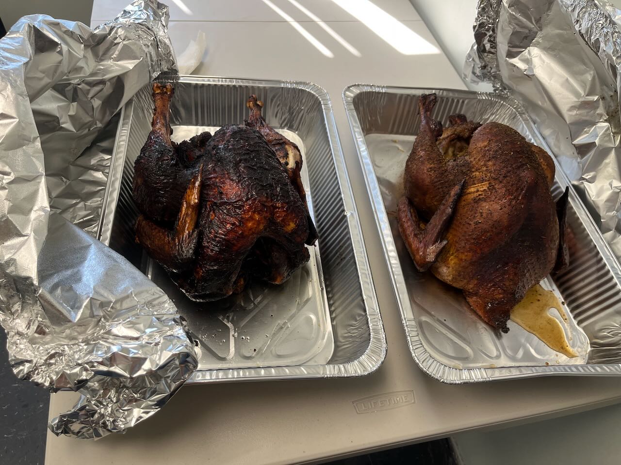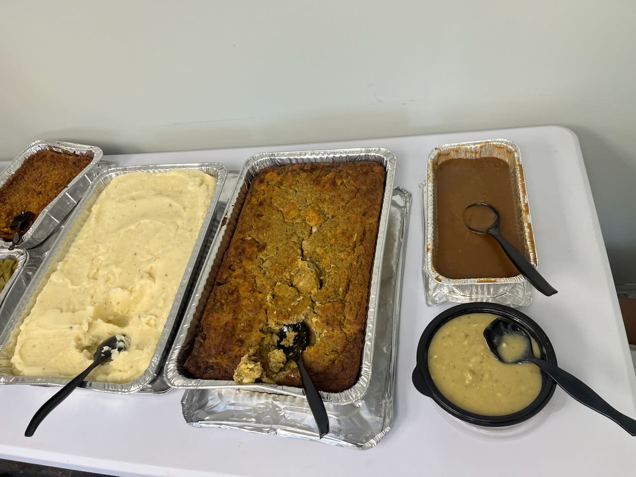 This year, we prepared two full 15-pound turkeys, both brined to lock in moisture and flavor. One was slow-smoked, rich with a deep, savory aroma. The other was deep-fried, giving it that crispy skin and juicy interior everyone looks forward to. Together they filled the lunchroom with the unmistakable scents of a true Thanksgiving feast.
